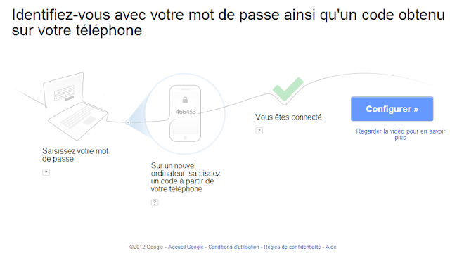 La configuration est achevée. Reste maintenant à définir comment obtenir les codes qui seront utilisés chaque fois que l'on se connecte à son compte à partir d'une machine non fiable. La première méthode est l'utilisation d'un téléphone (portable ou fixe). A chaque accès à son compte Gmail on doit recevoir soit un appel vocal soit un SMS nous indiquant le code à mettre. C'est une méthode qui n'est guère pratique.