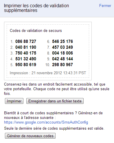Comment faire si on est en voyage et qu'on a pas le mobile qui a été configuré sur nous. C'est la raison d'être de la troisième méthode. Imprimer un jeux de codes utilisables une fois (des codes jetables). Pour cela, revenir sur l'écran obtenu juste après avoir terminé la configuration en quatre étapes et cliquer sur Afficher les codes de secours.