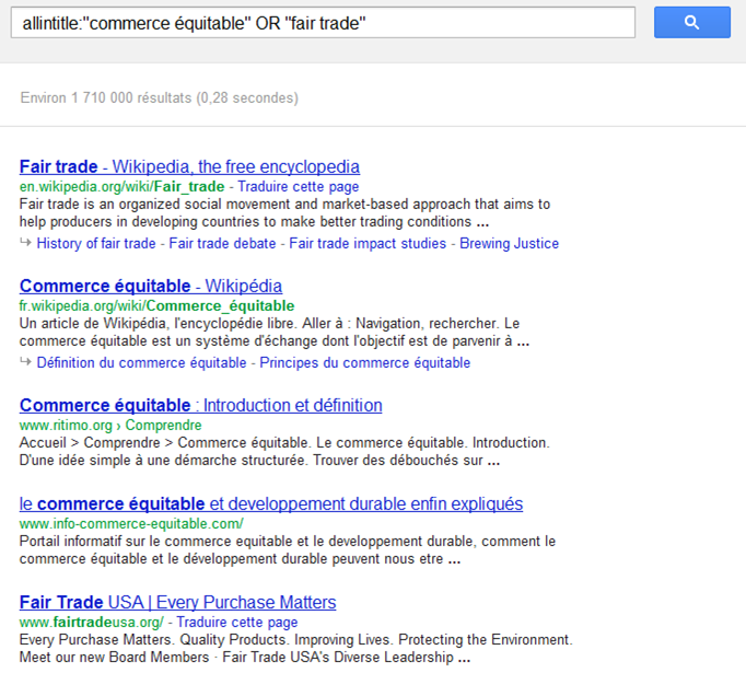 [ cuisine -livre -recette site:blogspot.com filetype:pdf ] pour chercher uniquement des fichiers PDF sur le domaine blogspot.com qui traite de cuisine mais en excluant livre et recette.[ allintitle:"commerce équitable" OR "fair trade" ] pour chercher des documents en français ou en anglais sur le commerce équitable.